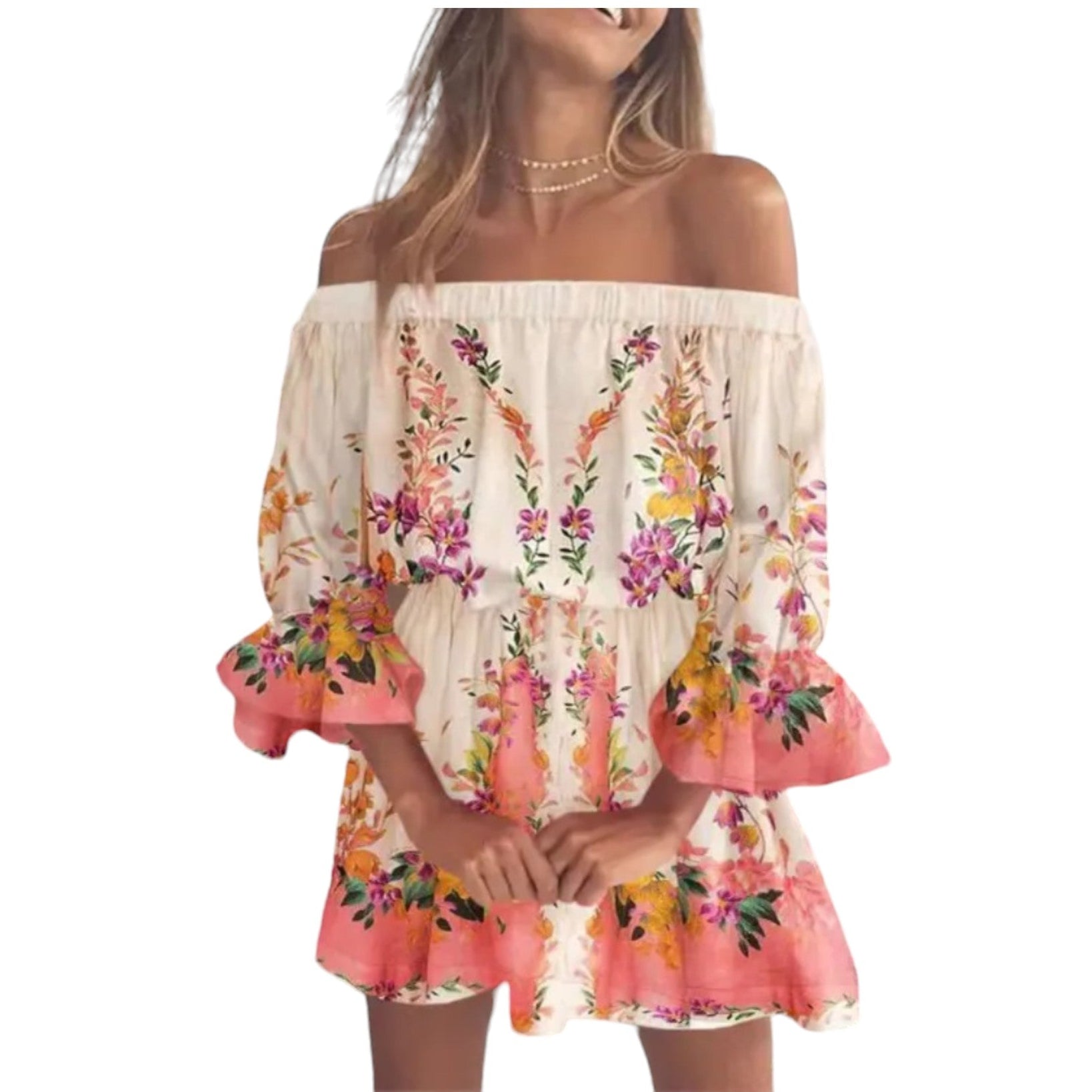 Schulterfrei, 3/4 Ärmel mit Gummibündchen, im Schulterbereich, in der Taille und in den Ärmeln, für einen perfekten Sitz.
