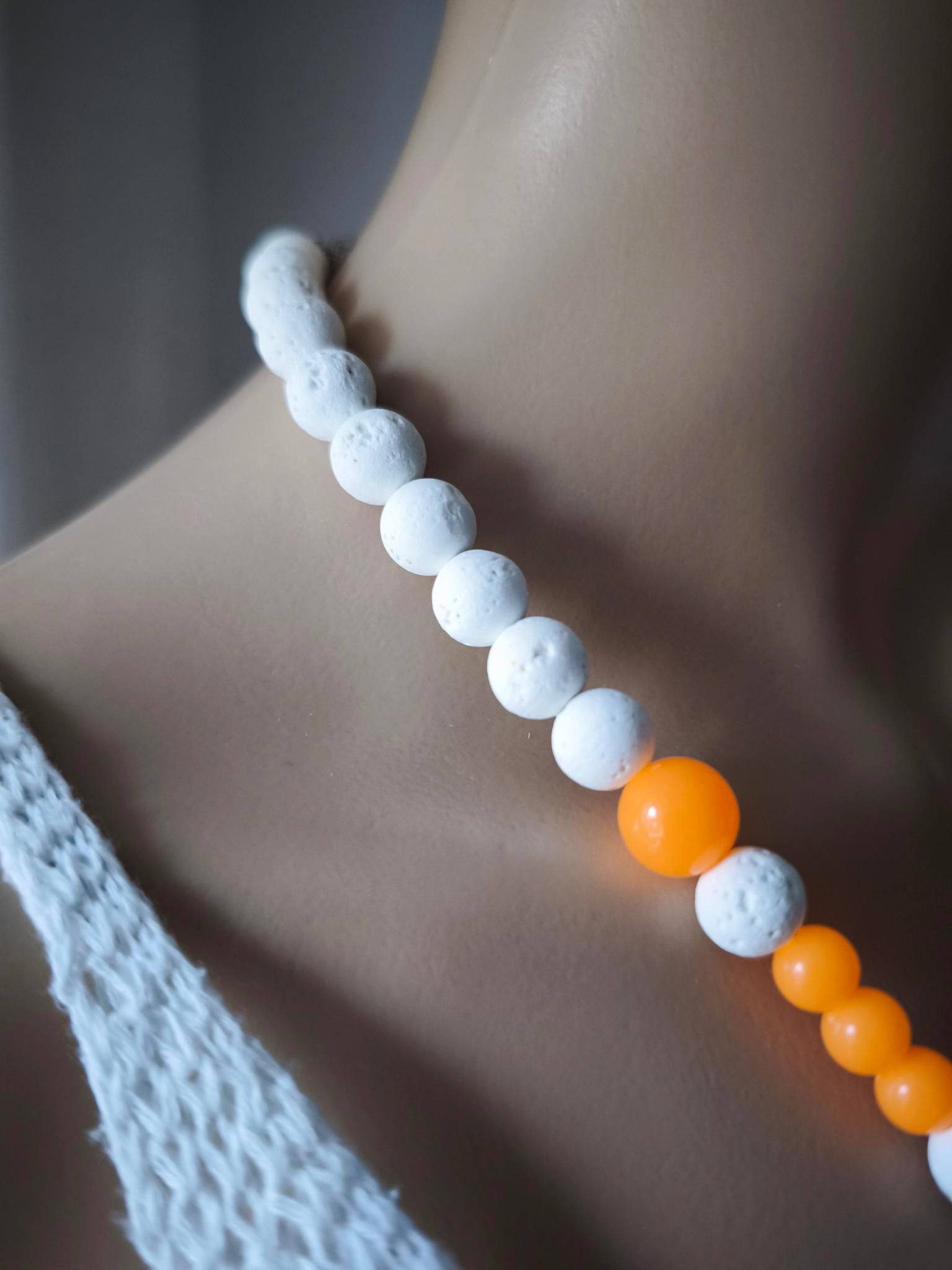 Wunderschöne Boho Kette aus Vulkanstein und Acryl Perlen.