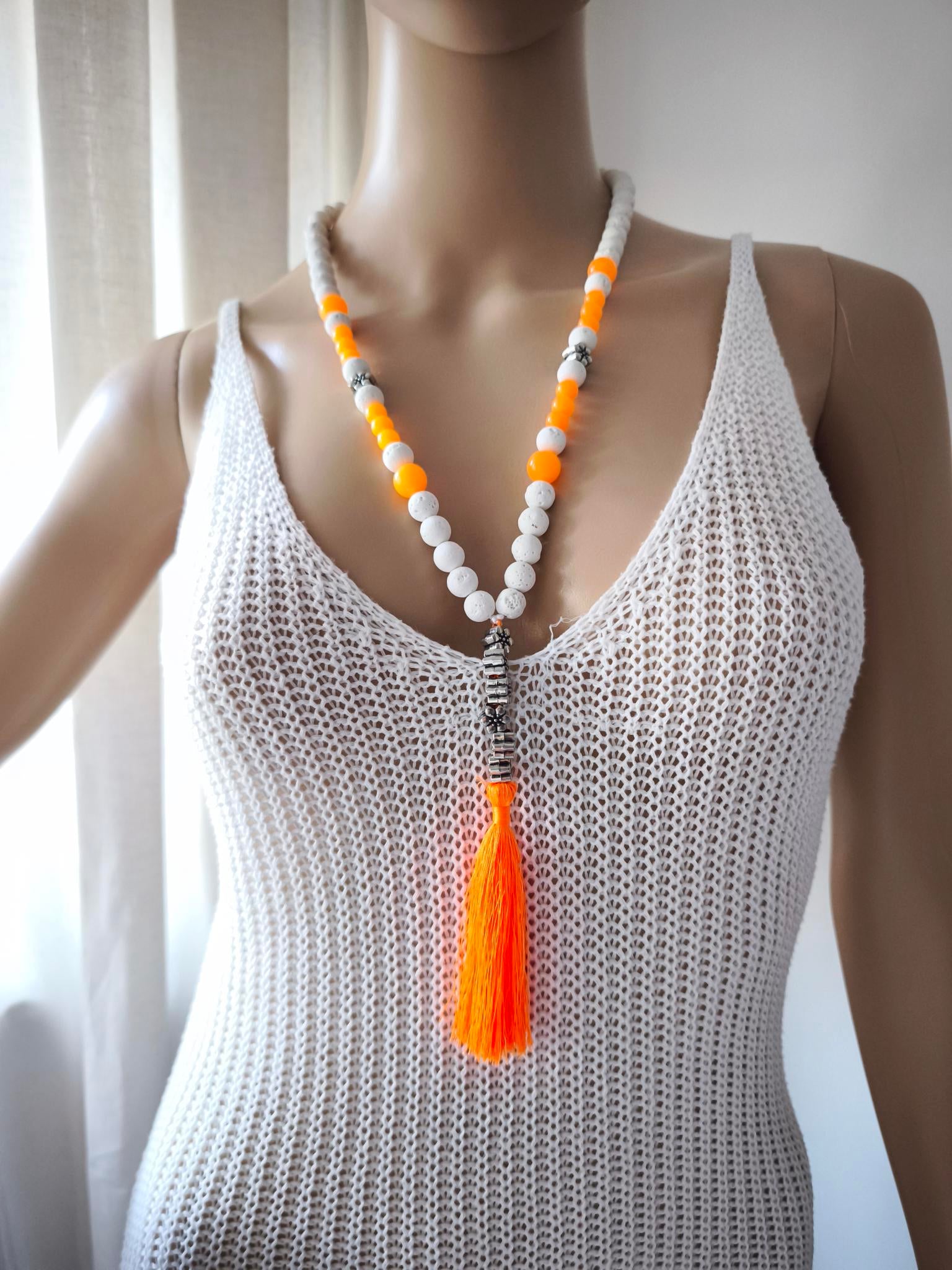 Boho Ibiza Halskette Hippie Festival Quaste XL Weiß Orange