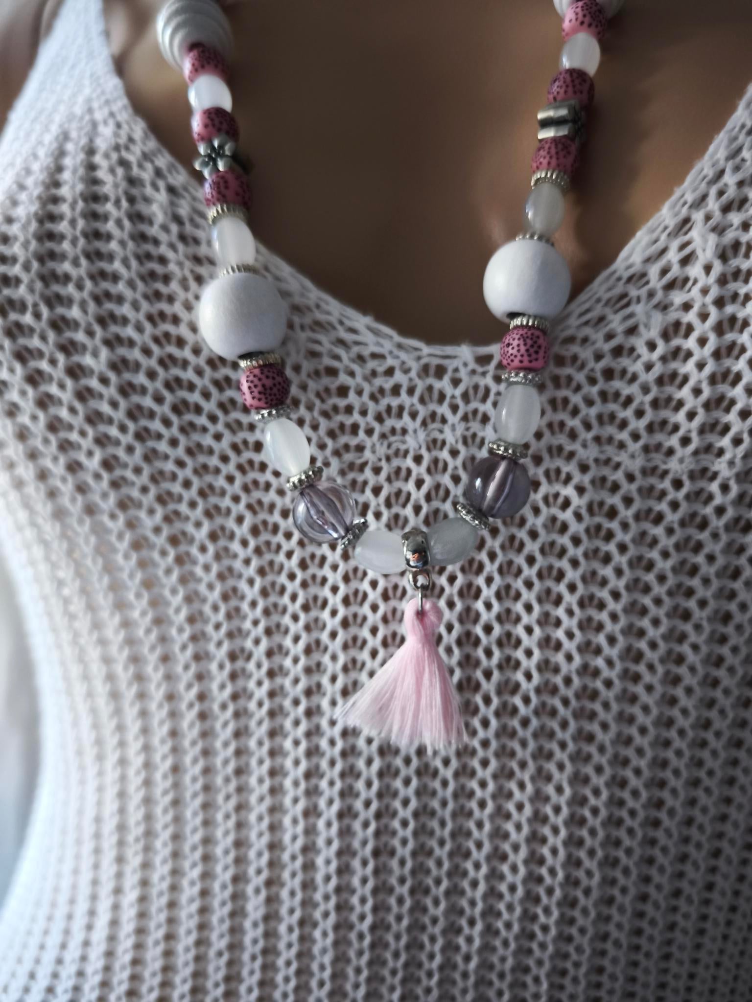 Boho Ibiza Halskette Hippie Festival Perlen Quaste White Rosa