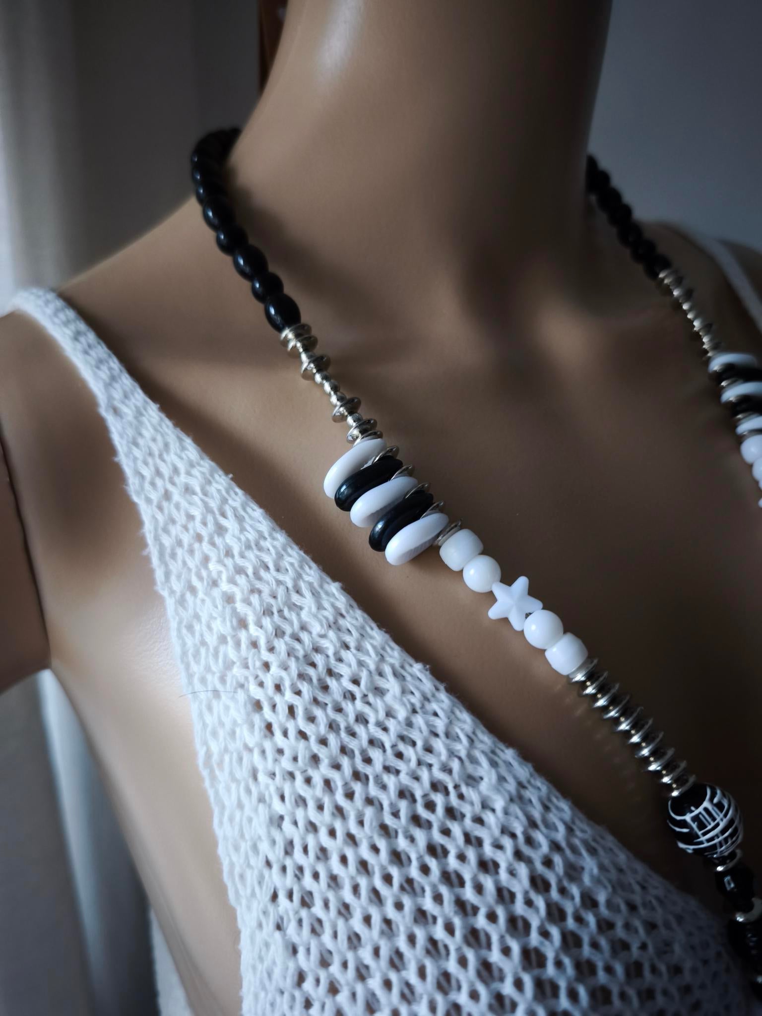 Wunderschöne XXL Boho Ibiza Kette aus Perlen, mit Quasten, Muscheln, vielen silbernen Details, Kreuze, Sterne in weiß und einen großen silbernen runden Anhänger. Im Halsbereich glänzende schwarze ovale und runde Perlen.