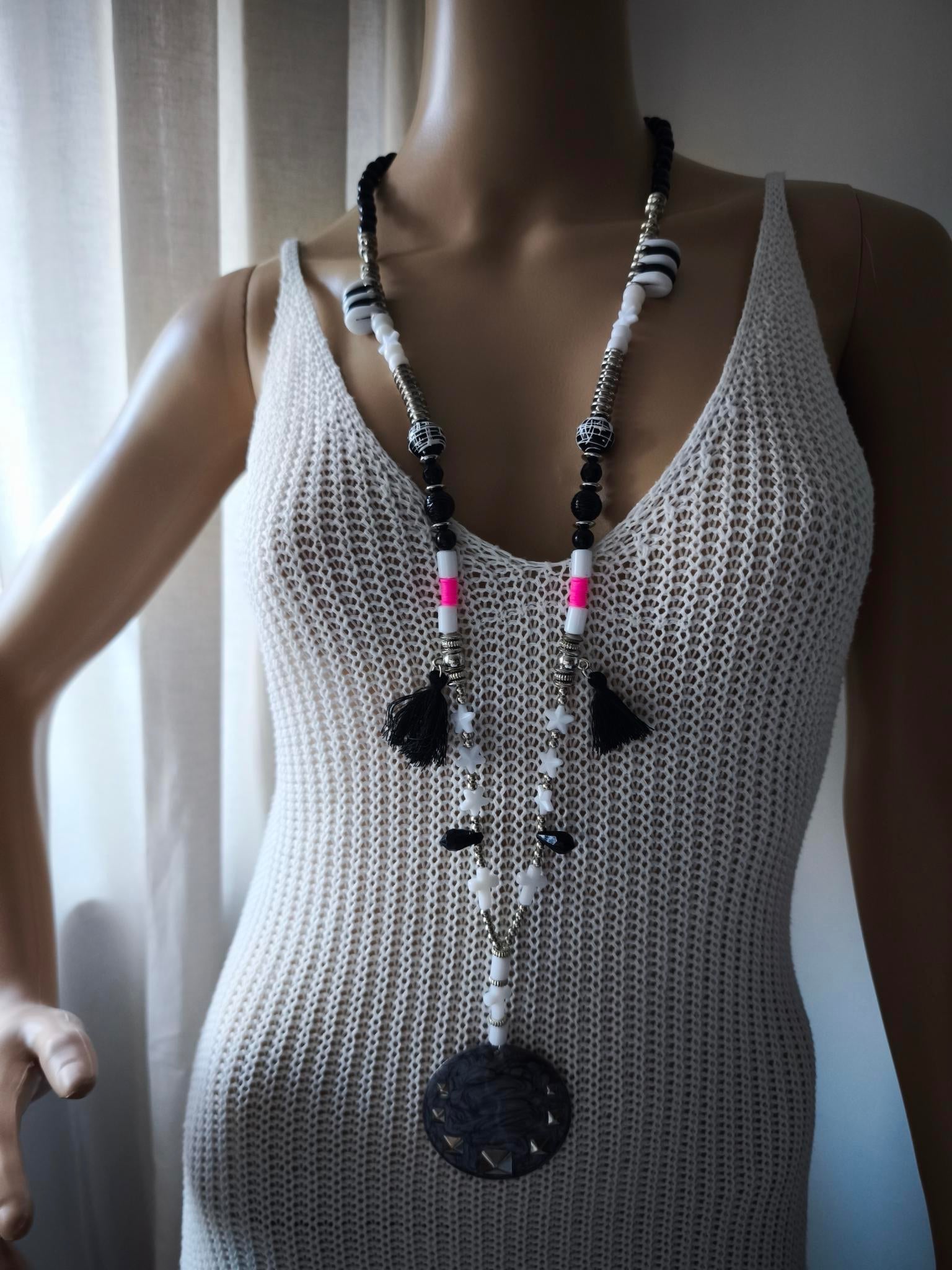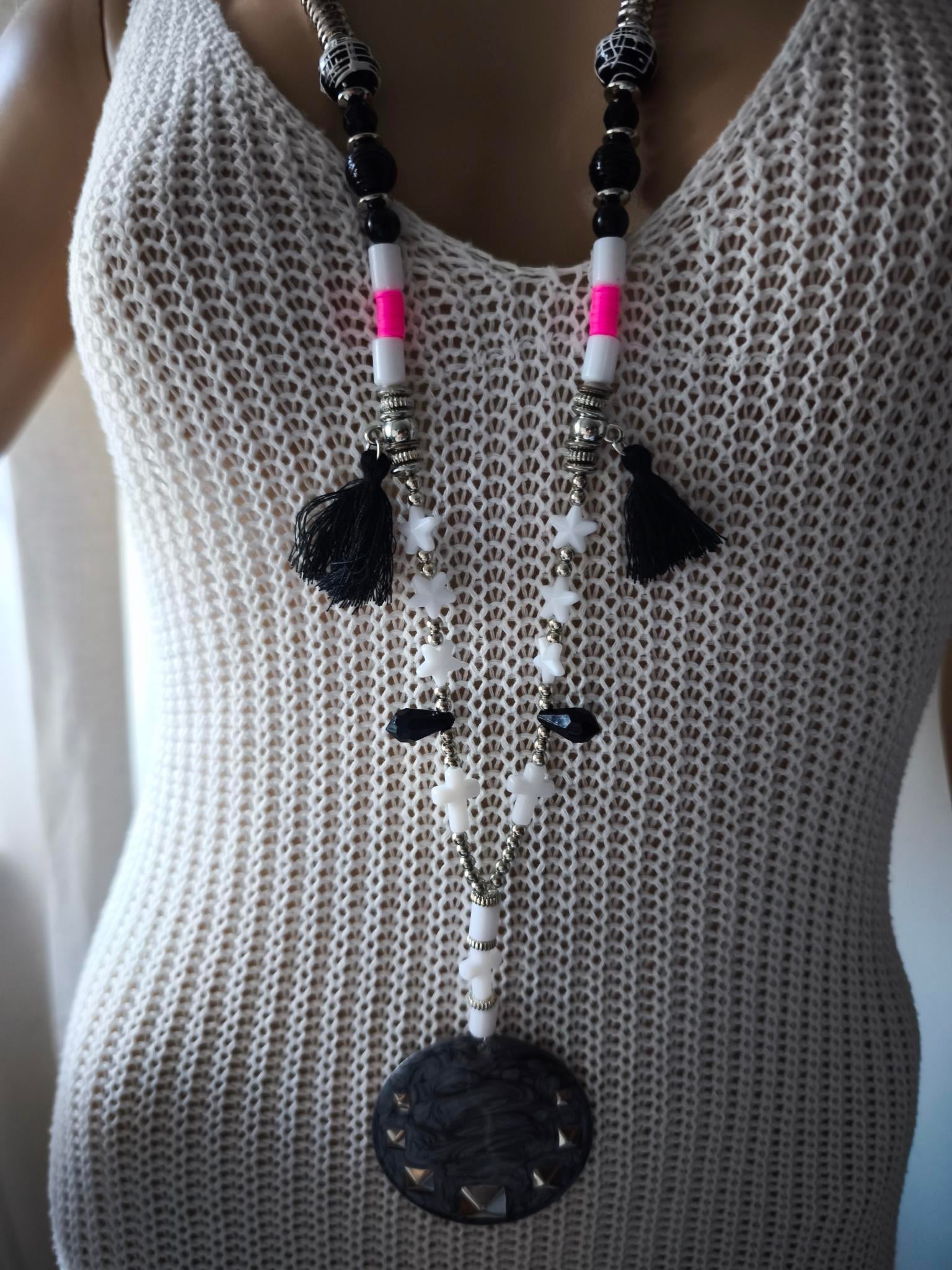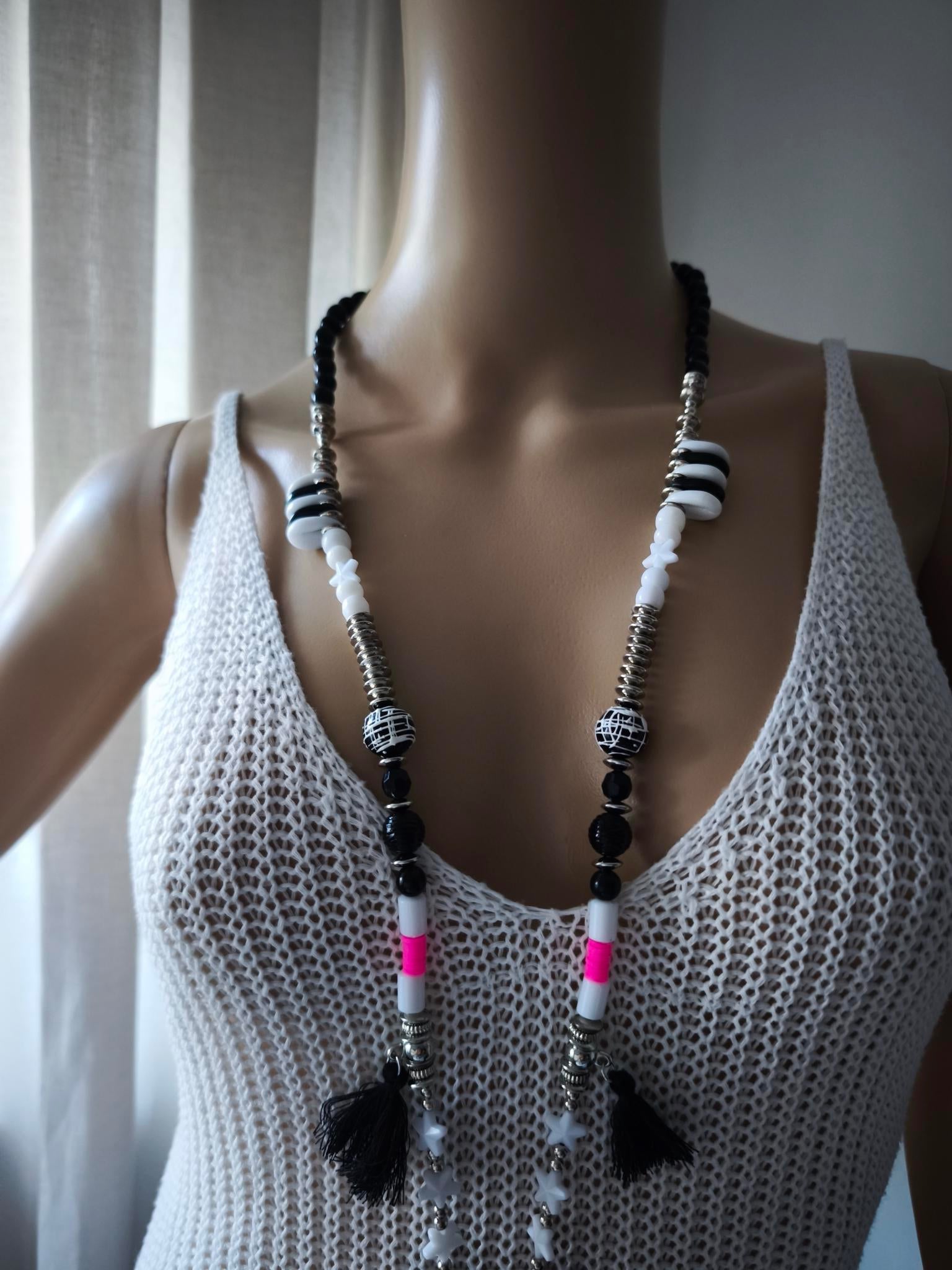 Boho Ibiza Halskette Hippie Festival XXL Schwarz Weiß Pink mit Silber
