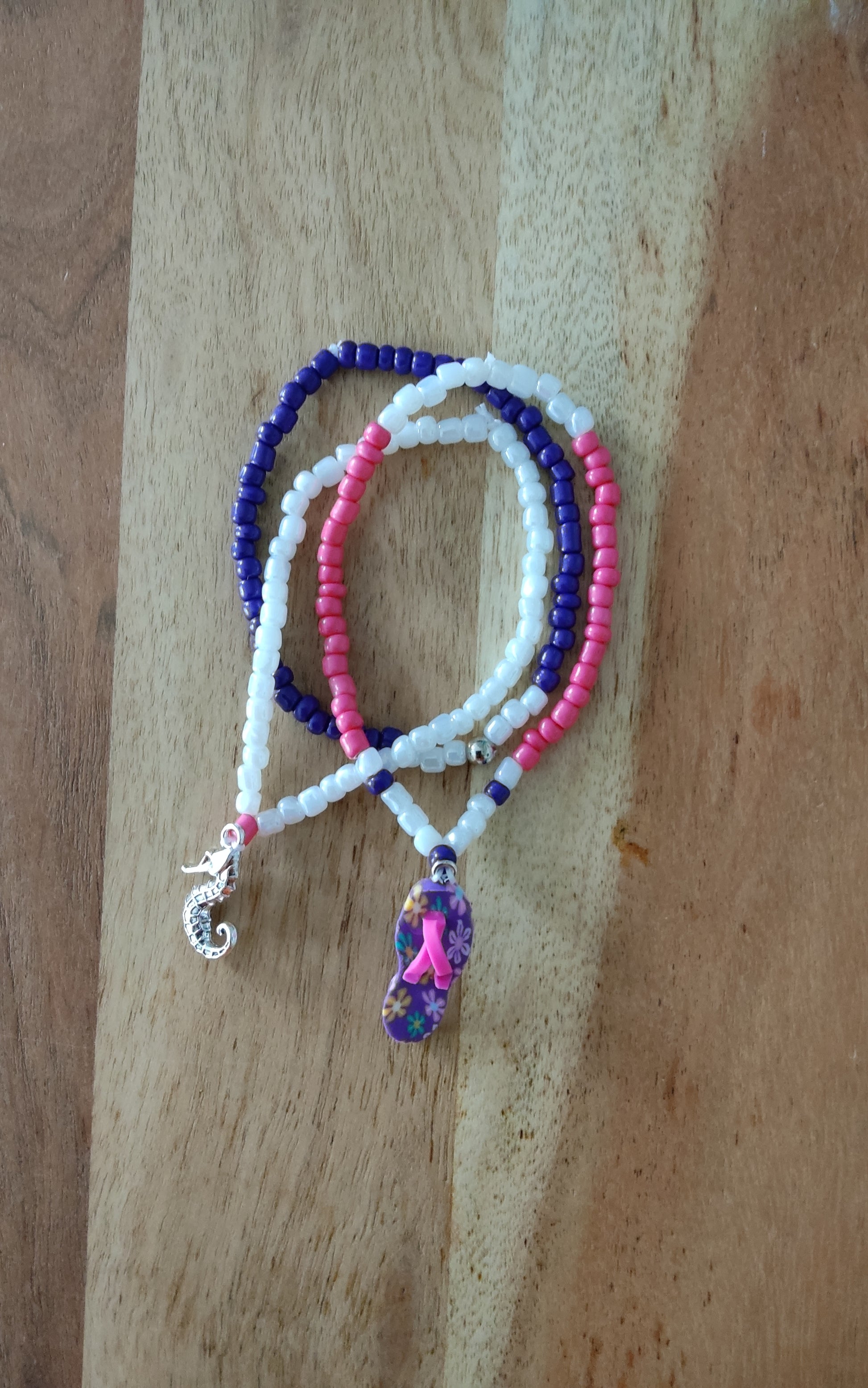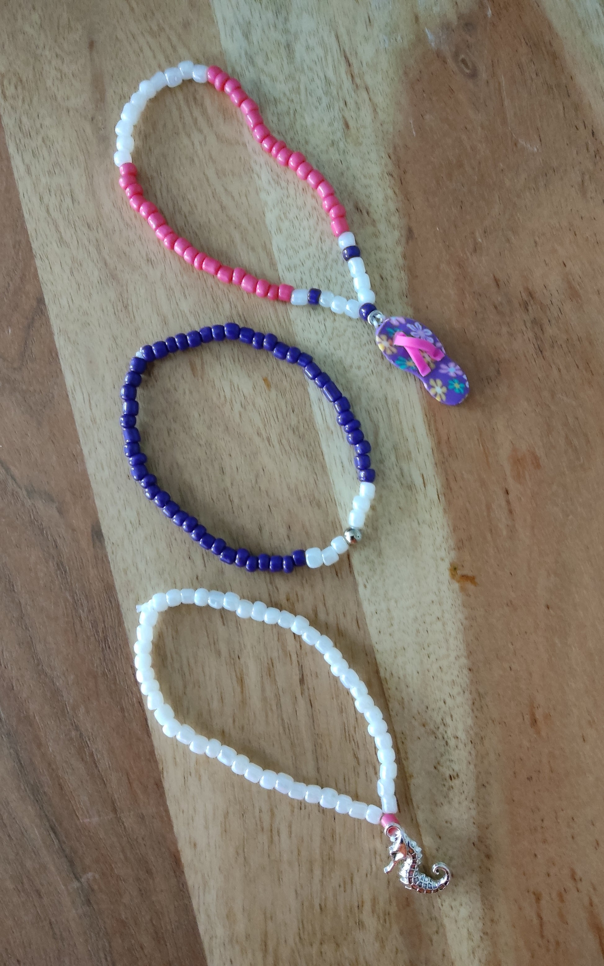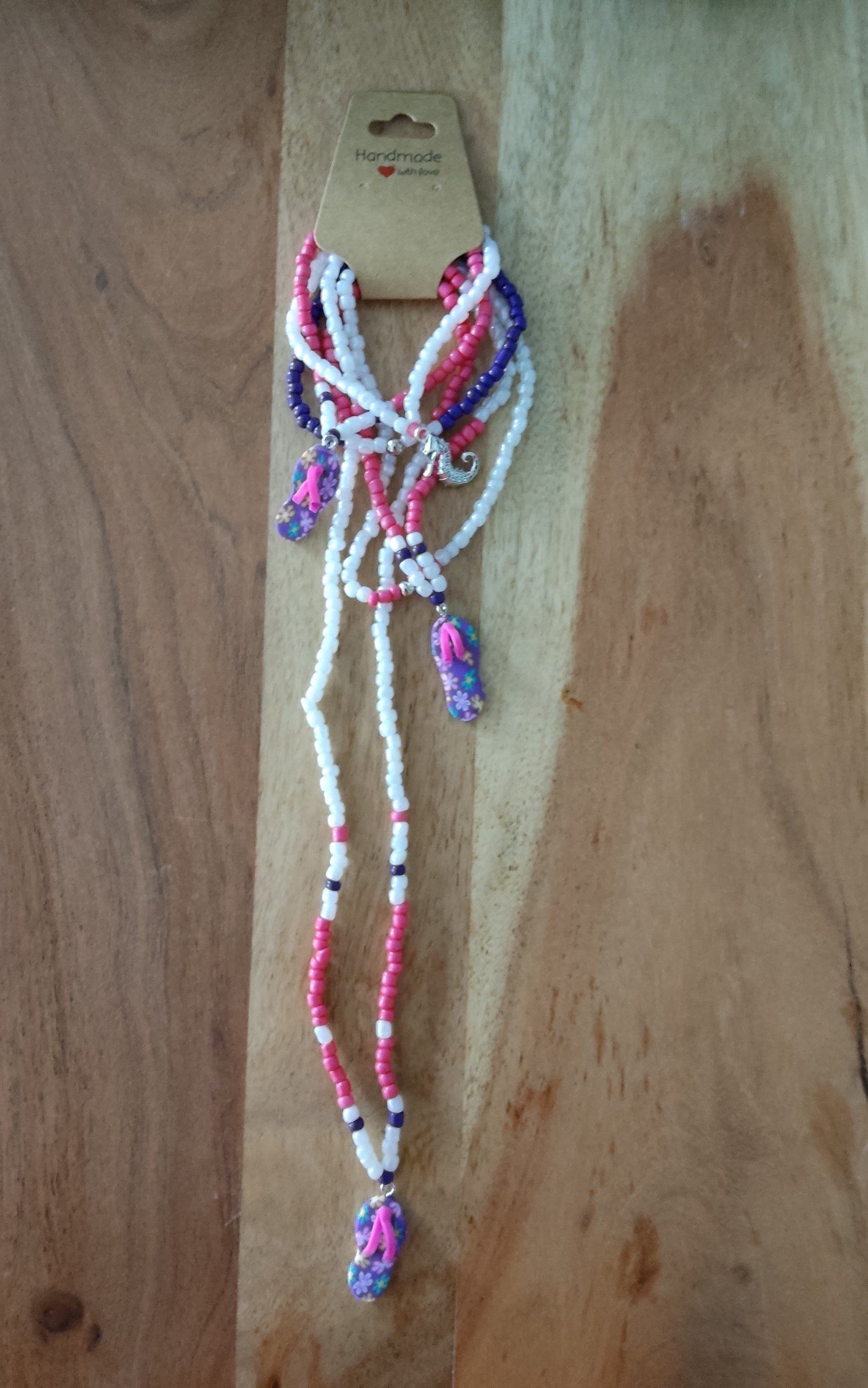 Süßes Ibiza Boho Hippie Ketten Set mit Mini Flip Flop Design als Anhänger, 6 tlg. Set, bestehend aus einer Halskette, drei Armbändern und zwei Fußkettchen, in den sommerlichen Farben Pink, Lila und Weiß, alles aufeinander abgestimmt. Ein Armband mit einem süßen silbernen Seepferdchen. Alle Ketten aus Stretch hergestellt. Überziehen... fertig. Wer Ibiza, Boho und den Strand liebt, strahlt dieses mit diesem hübschen Ketten Set auf jeden Fall aus.