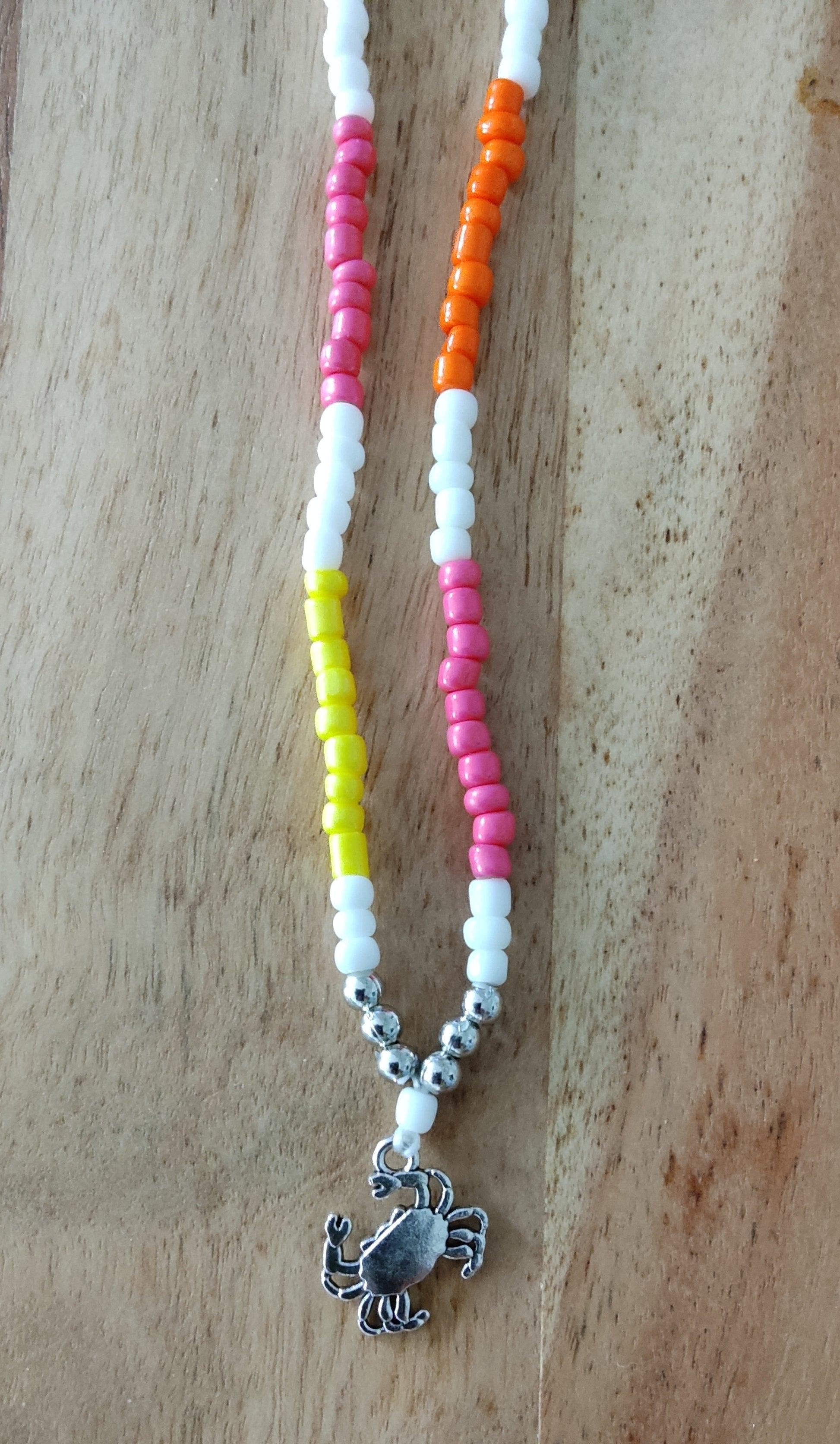 Ibiza Boho Hippie Süßes Ketten Set 5 tlg., bestehend aus einer Halskette, drei Armbändern und ein Fußkettchen in den Sommer Farben Weiß Pink Orange und Grün, alles mit silbernen kleinen Krabben-Anhängern und silbernen Perlen abgesetzt. Alle Ketten aus Stretch hergestellt, einfach überziehen und fertig. Ein Armband mit den Buchstaben HIPPIE;) Wunderschönes Accessoire für jede Boho-Liebhaberin. Passt zu jedem Sommer-Outfit. Durch den leuchtenden Farben mit dem strahlenden Weiß, ist dieses Set ein absoluter Hingucker. Einzigartig!