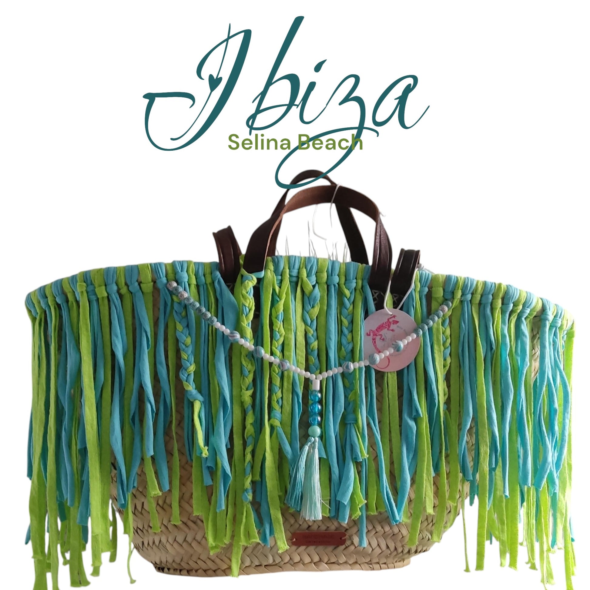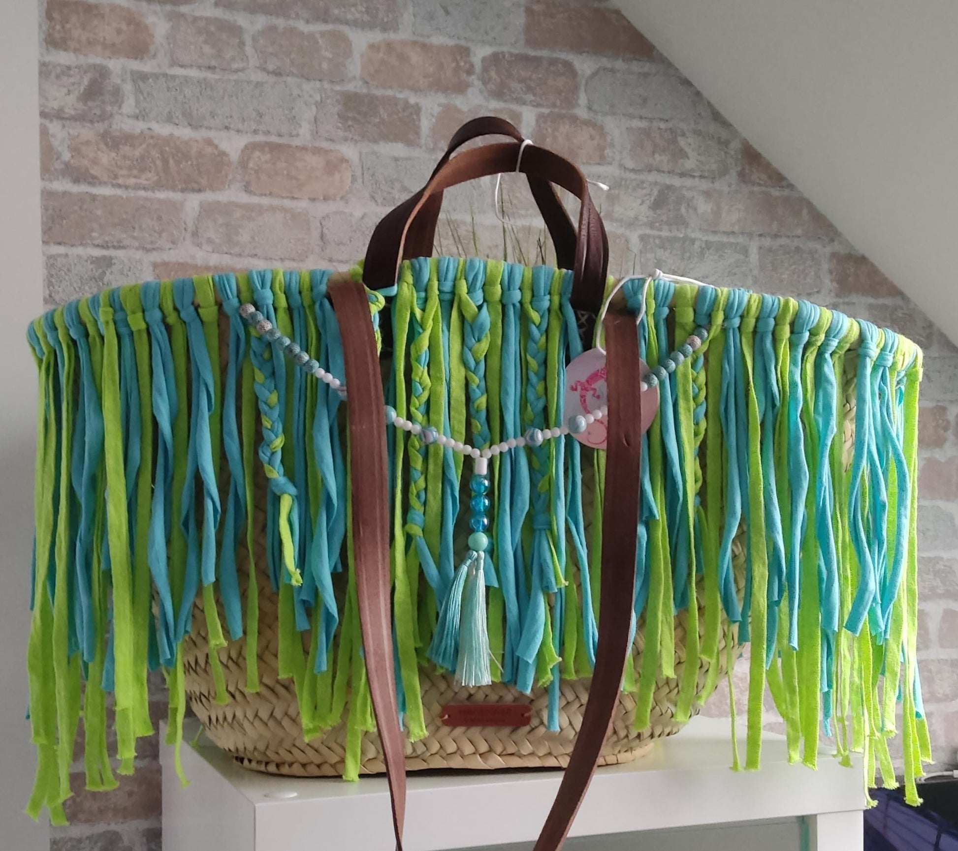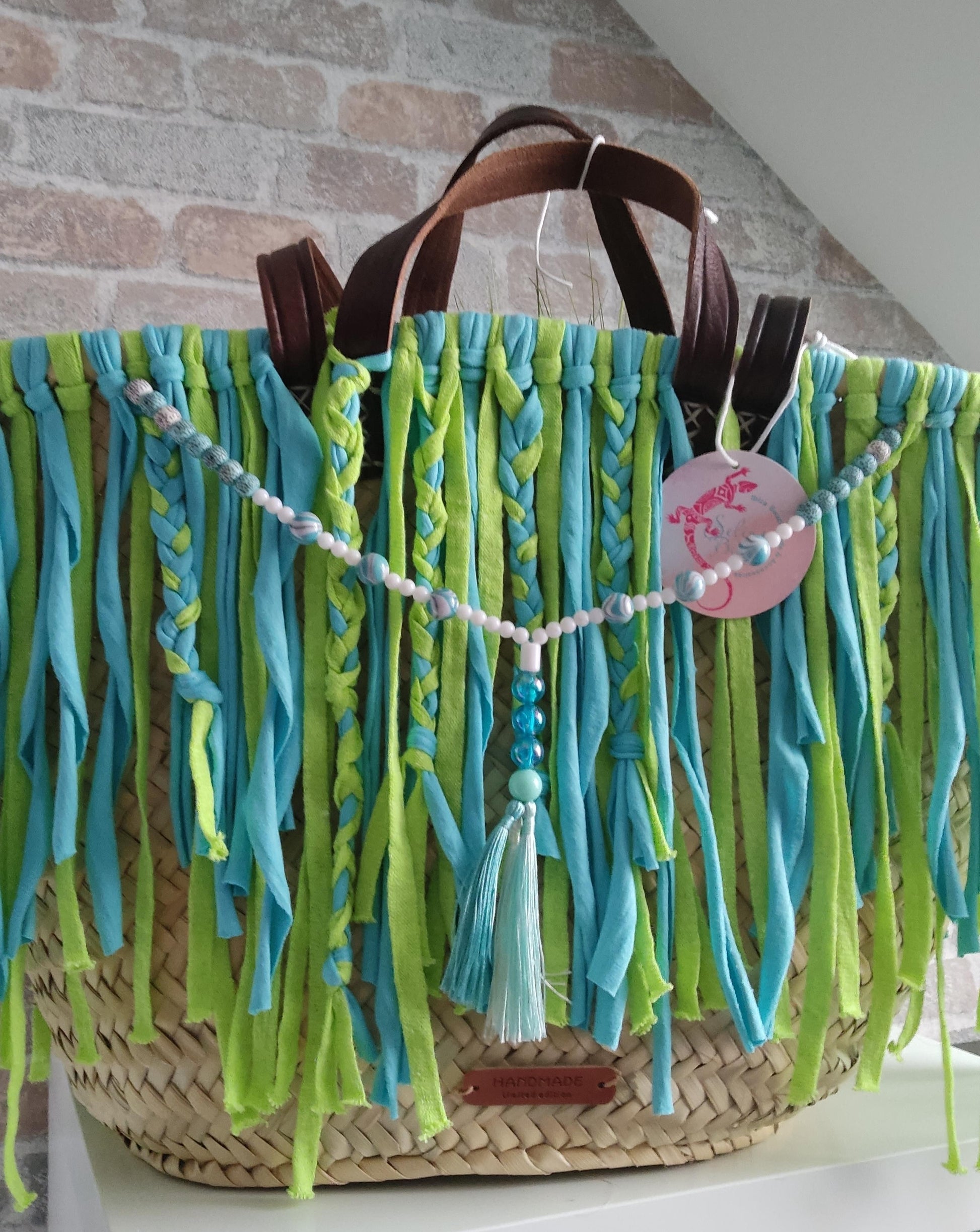 Mit ihren vielen Fransen in den sommerlichen Farben Türkis und Apple-Green und der dekorativen Boho Kette vorn, macht diese hübsche Ibiza-Korbtasche einfach Lust auf Sommer, Sonne Strand und Meer.