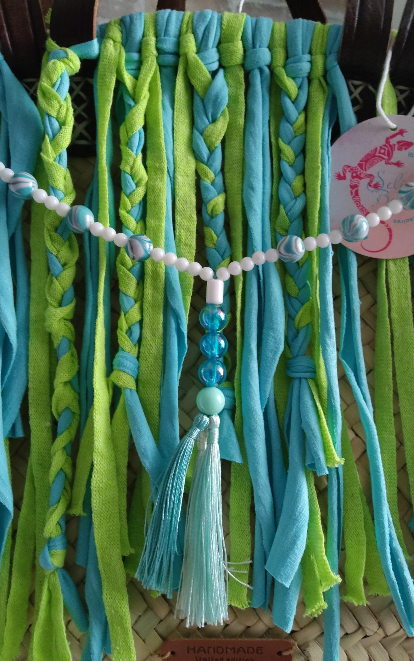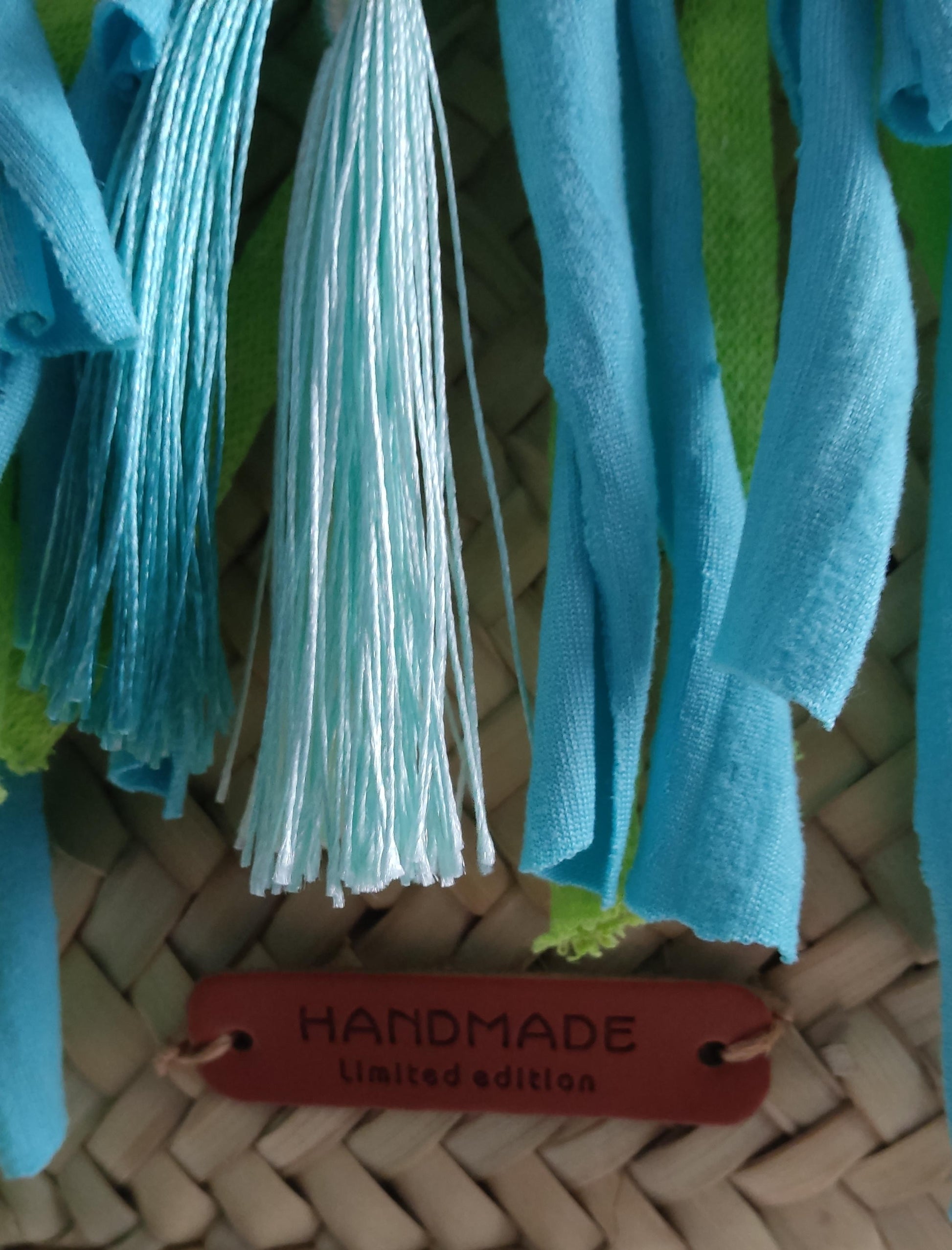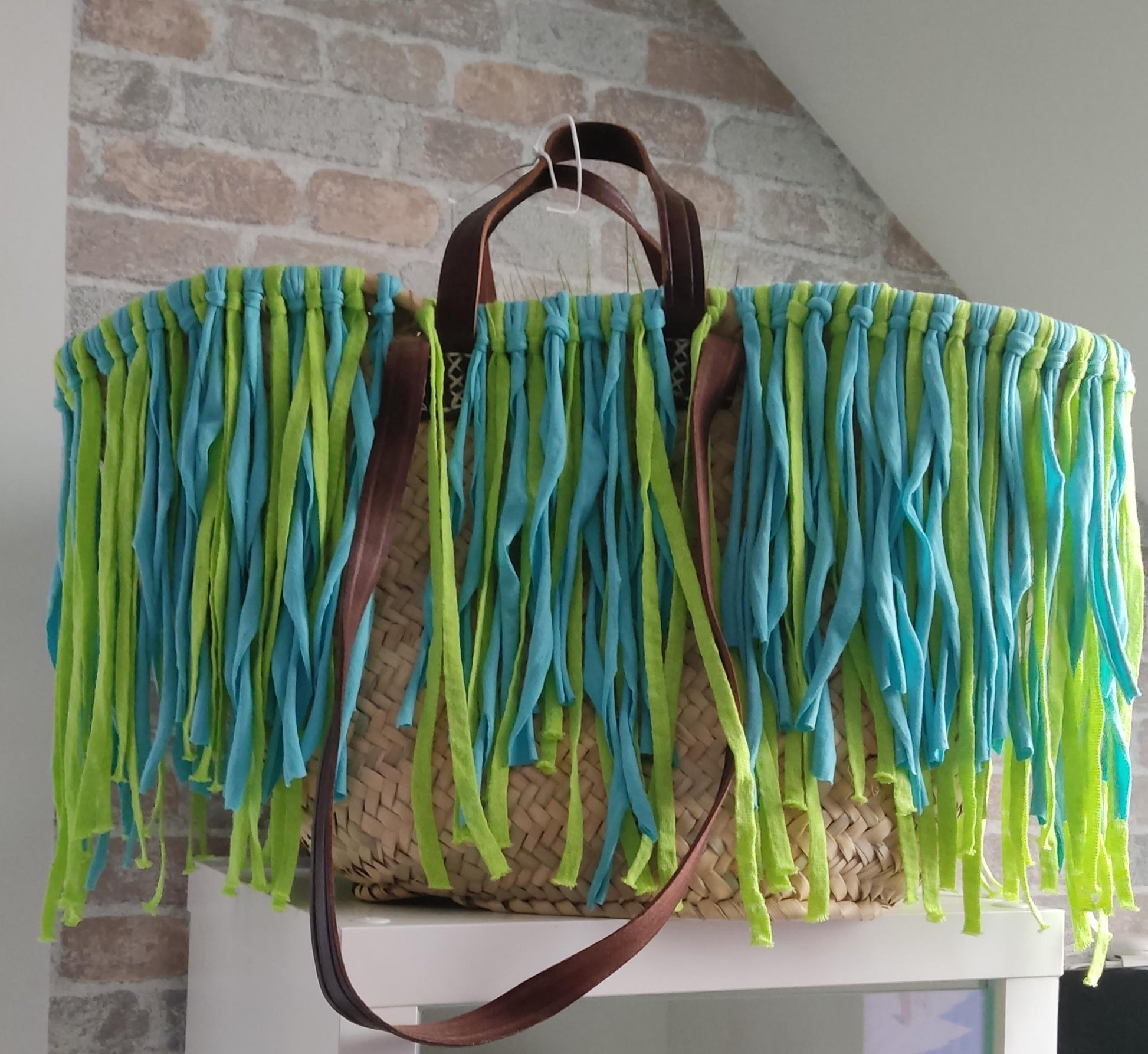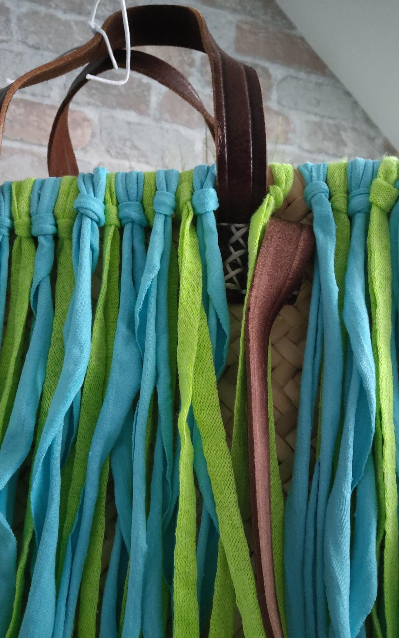 Mit ihren vielen Fransen in den sommerlichen Farben Türkis und Apple-Green und der dekorativen Boho Kette vorn, macht diese hübsche Ibiza-Korbtasche einfach Lust auf Sommer, Sonne Strand und Meer.