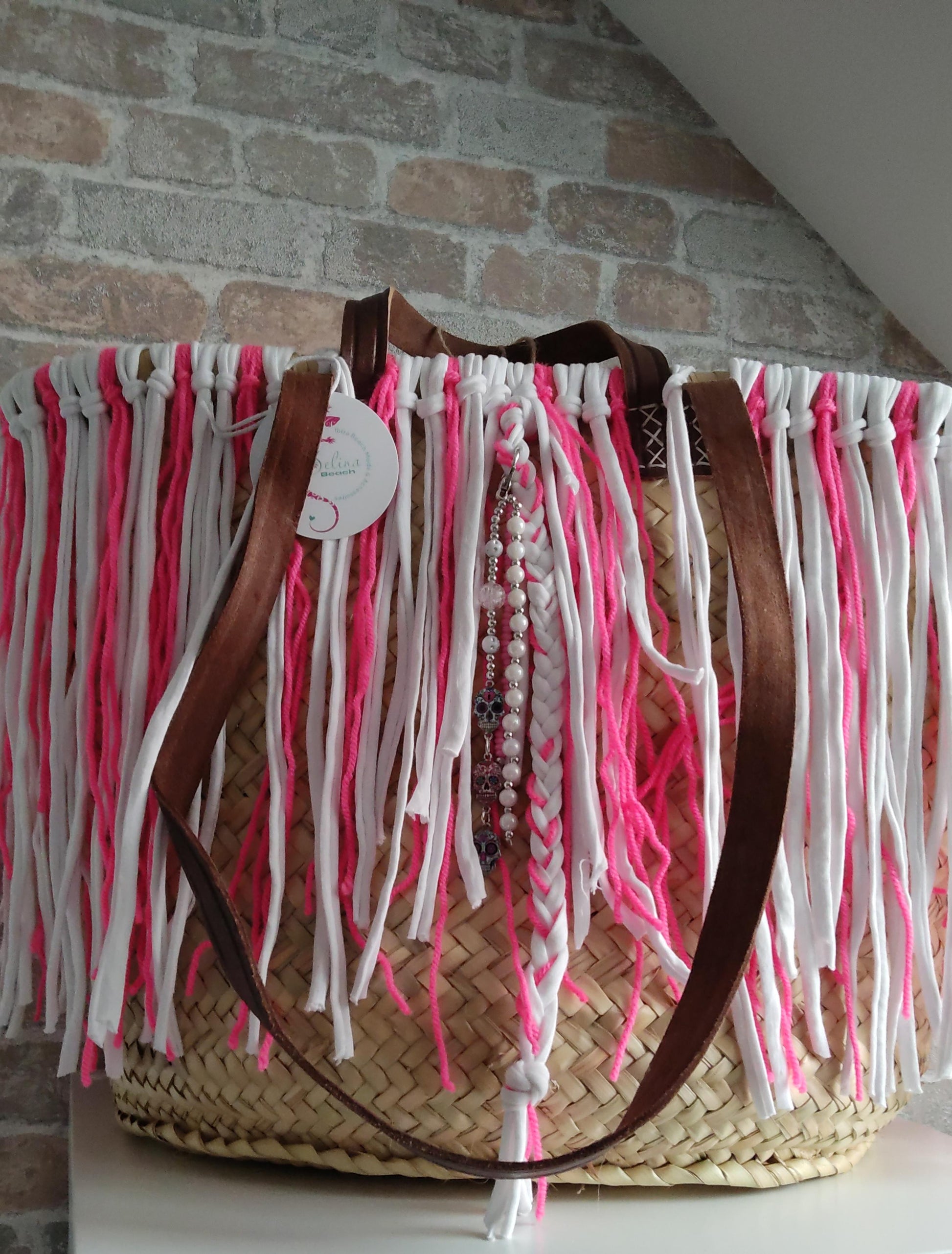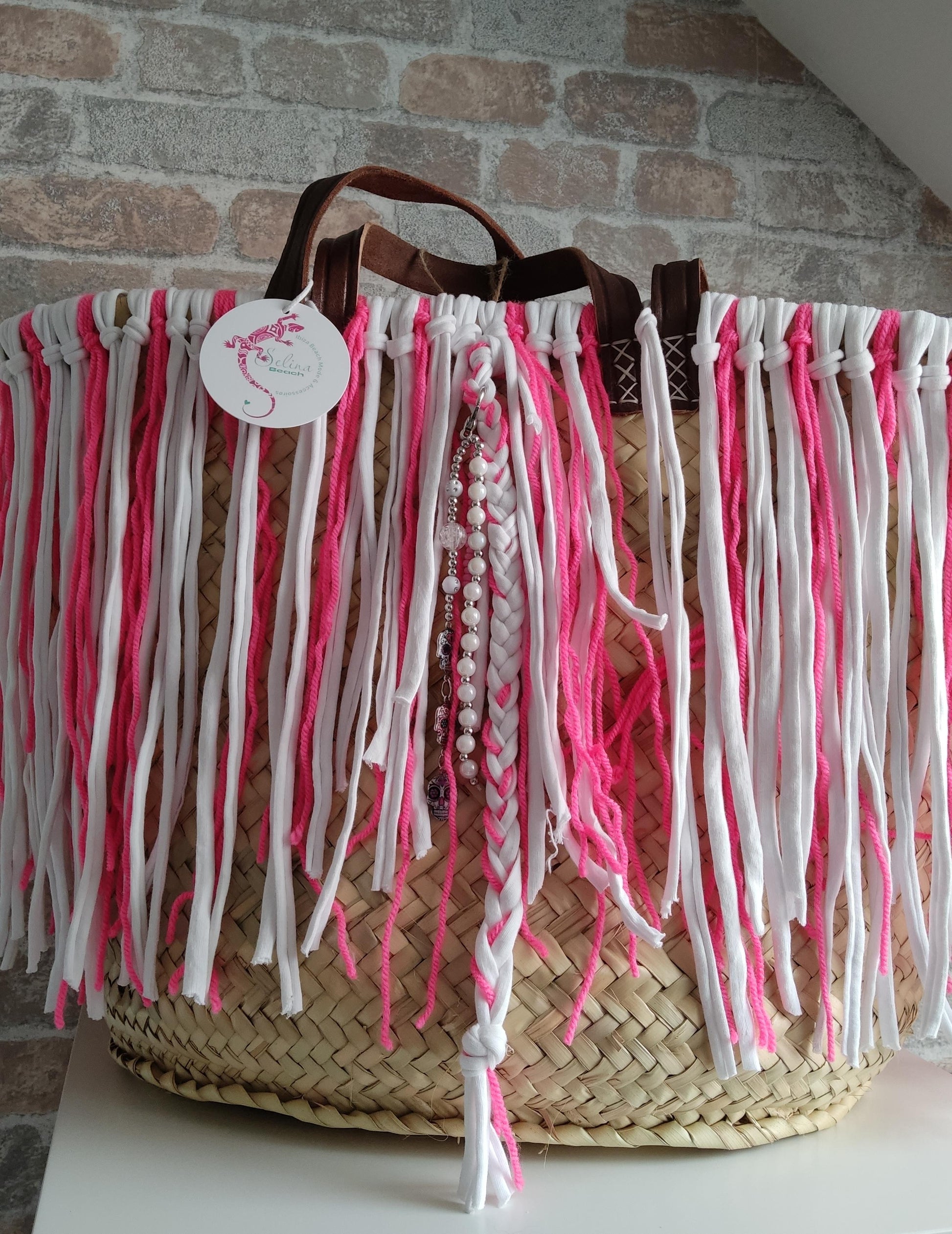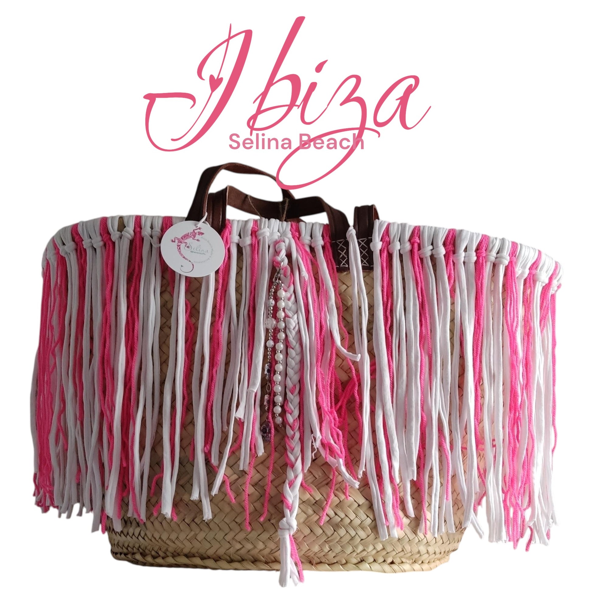 Ibiza Korbtasche Strandtasche XXL Boho Pink/White Hand Made