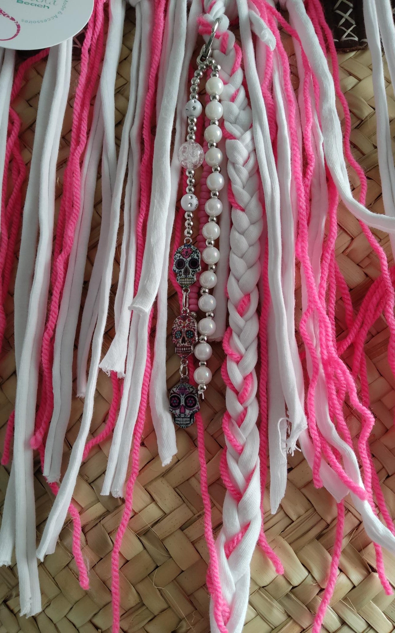 Mit wilden Fransen in den sommerlichen Farben Pink und Weiß. Als Accessoire ziert vorn ein geflochtener Zopf aus den gleichen Bändern wie Fransen und eine hübsche Kette mit wunderschönen Skull Motiven in Silber, abnehmbar durch einen dekorativen Karabinerhaken, ebenfalls Silber.