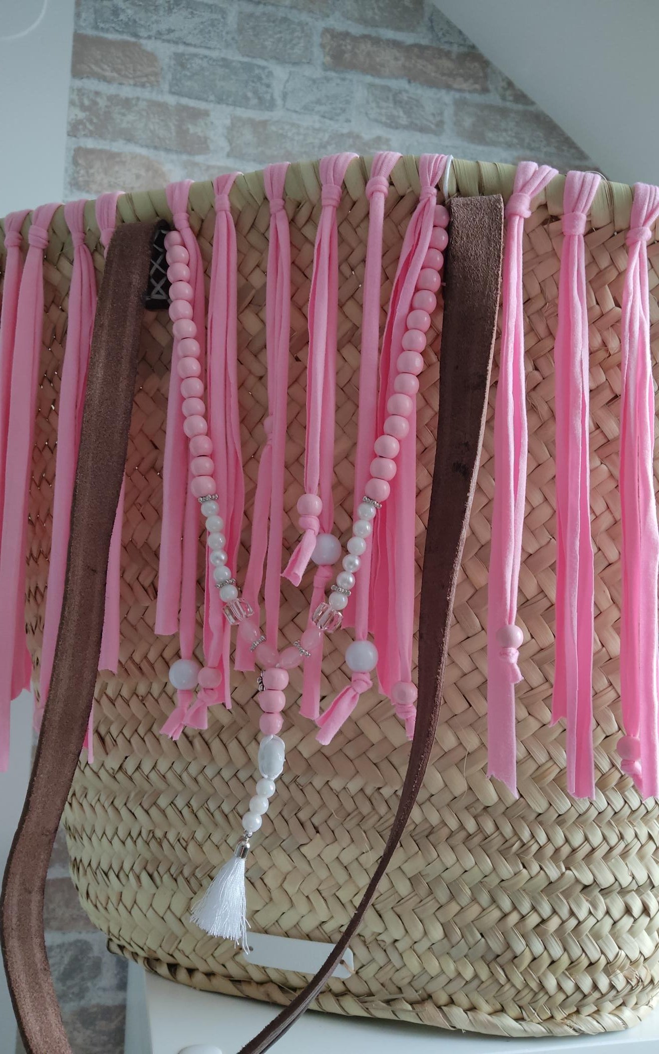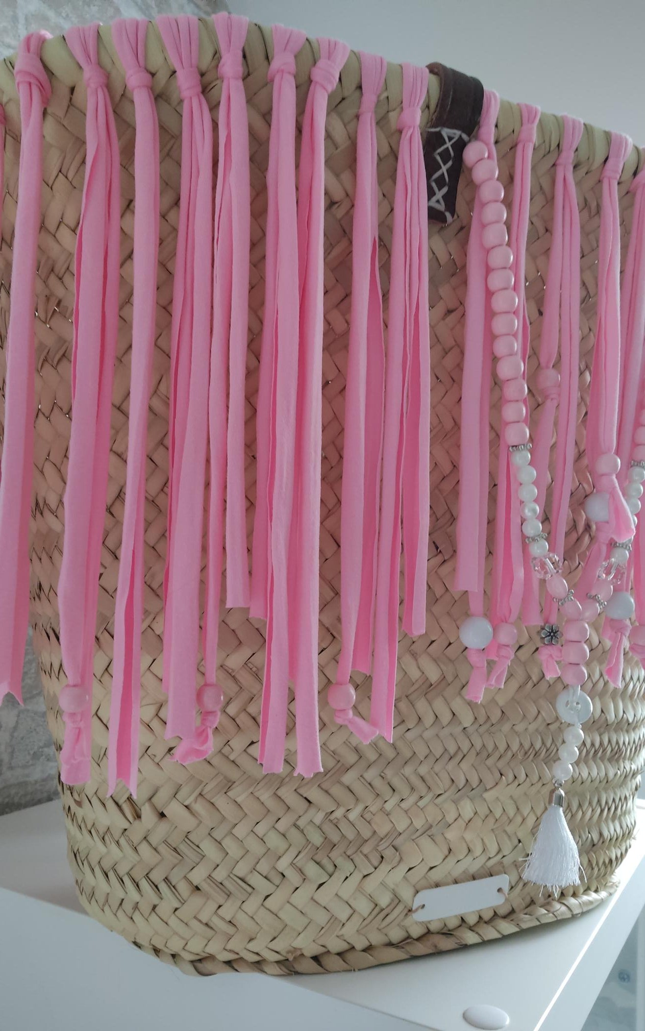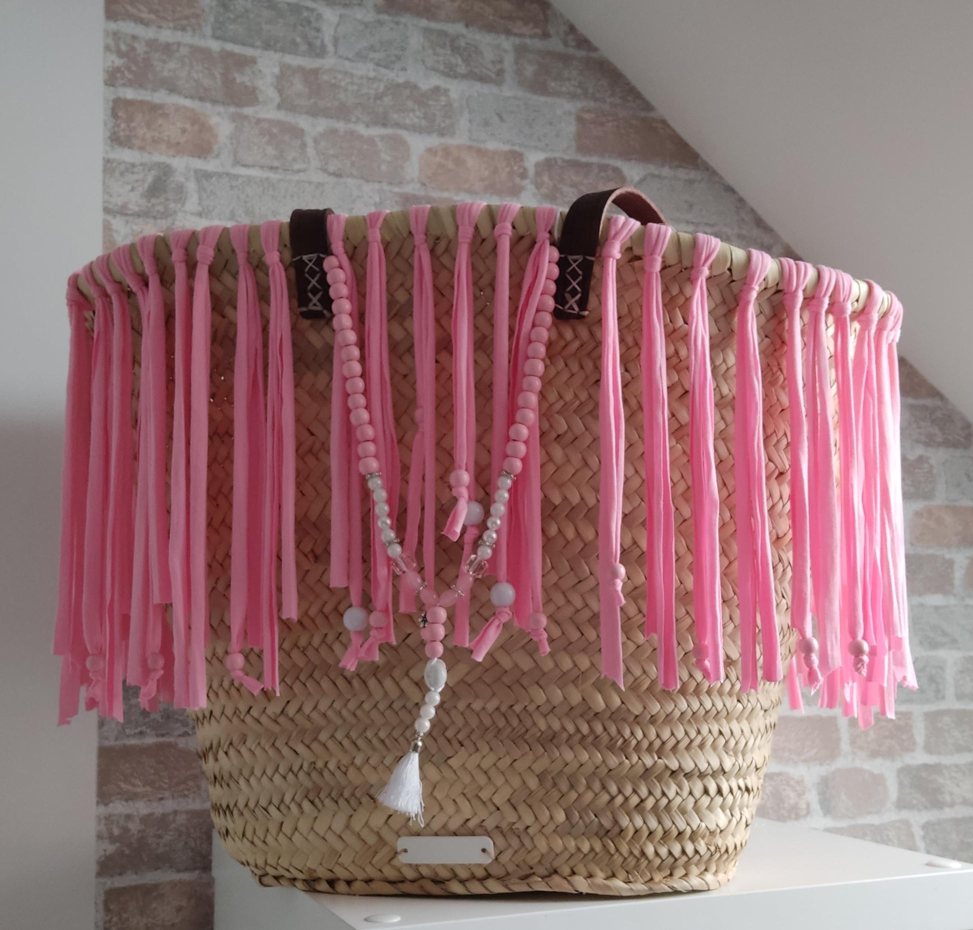 Ein Traum in Rosa Ibiza Korbtasche Strandtasche Shoppingtasche Boho XXL mit Fransen in Baby Rosa, zusätzliches Accessoire vorn... eine passende Boho Kette (Hand Made) aus Holzperlen und weißer Bommel/Quaste.