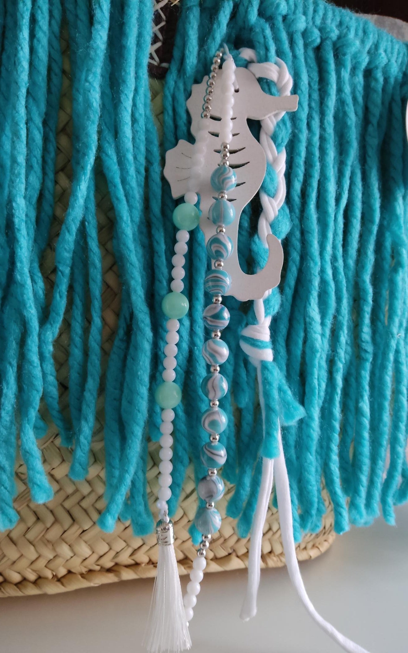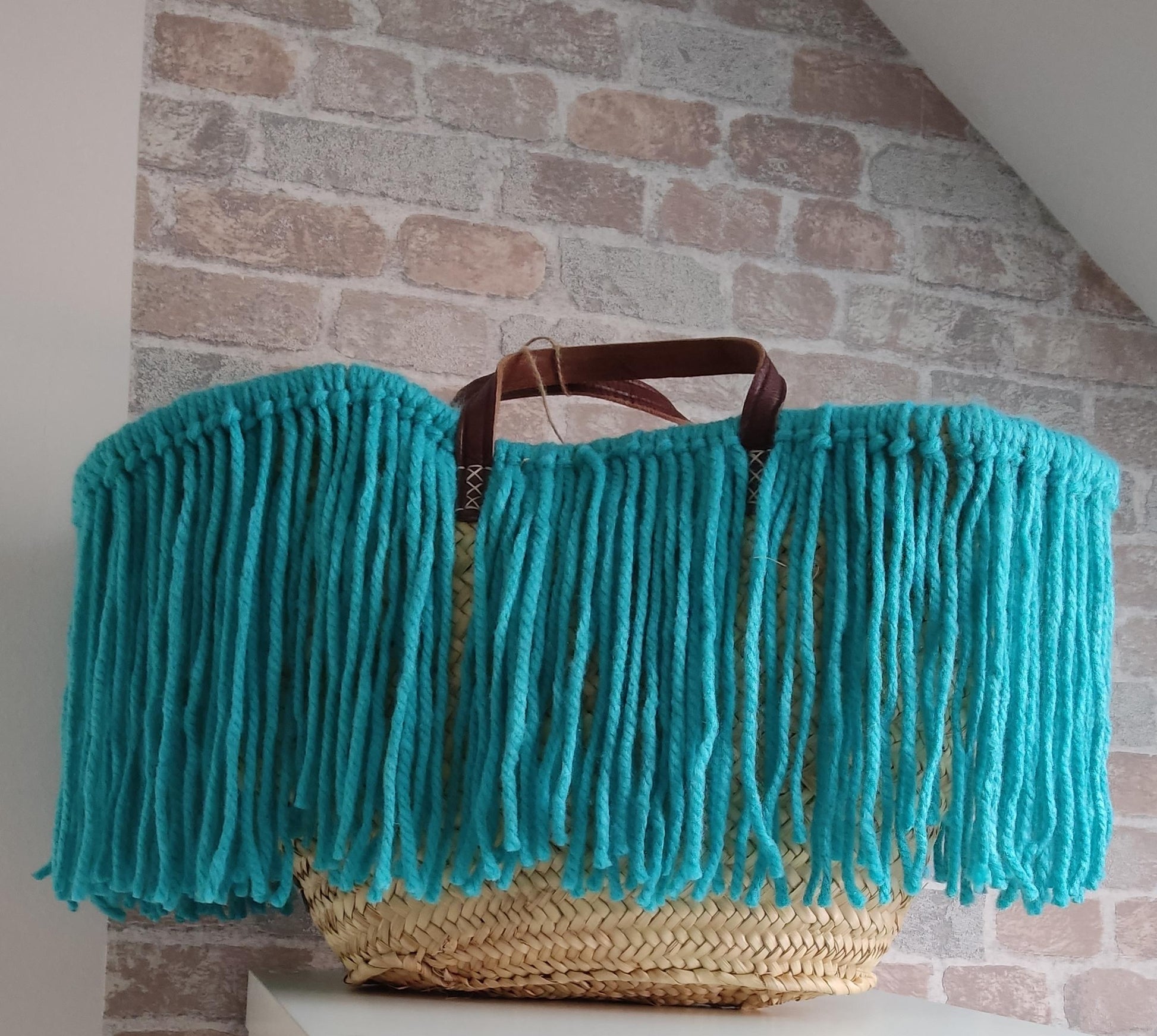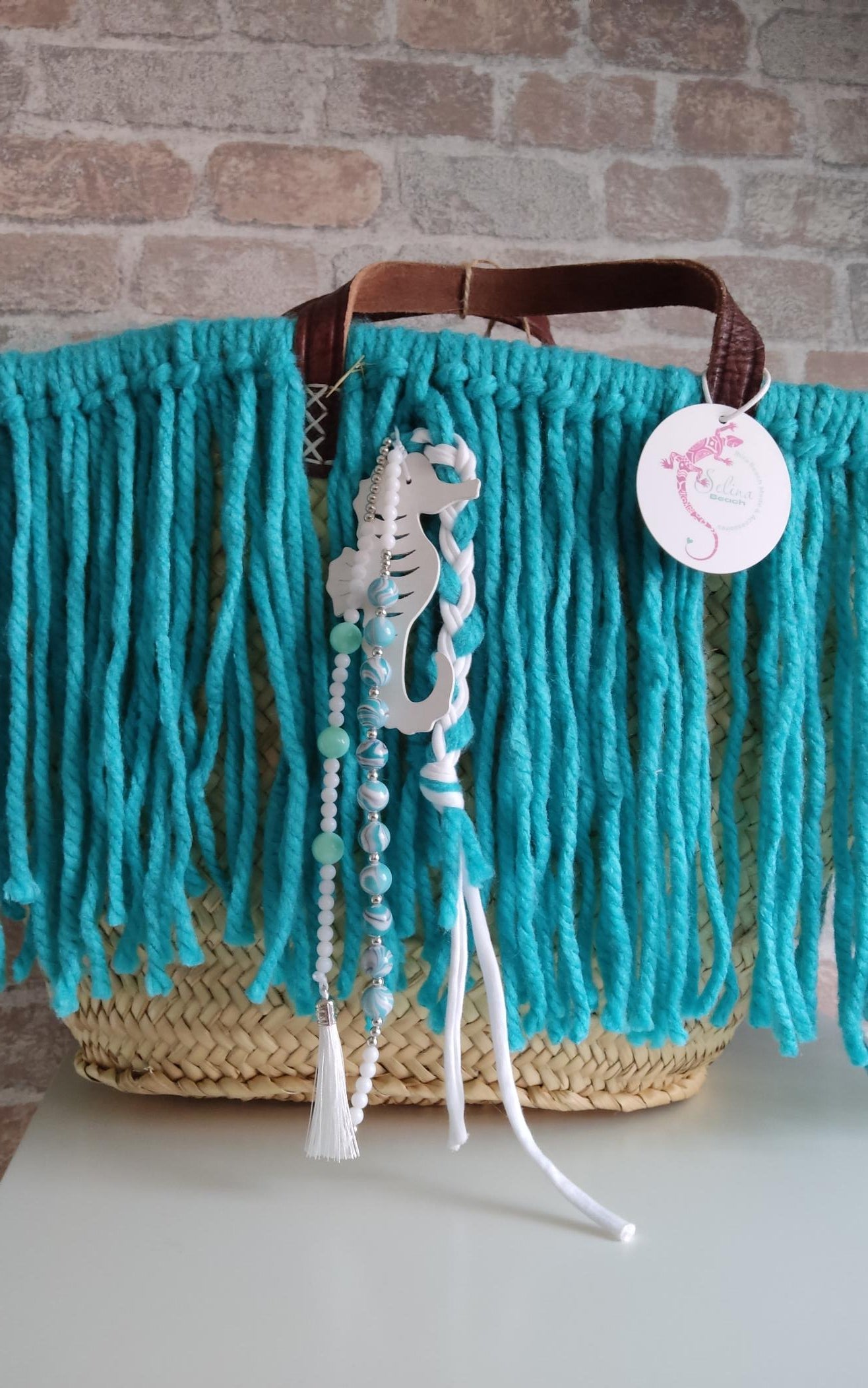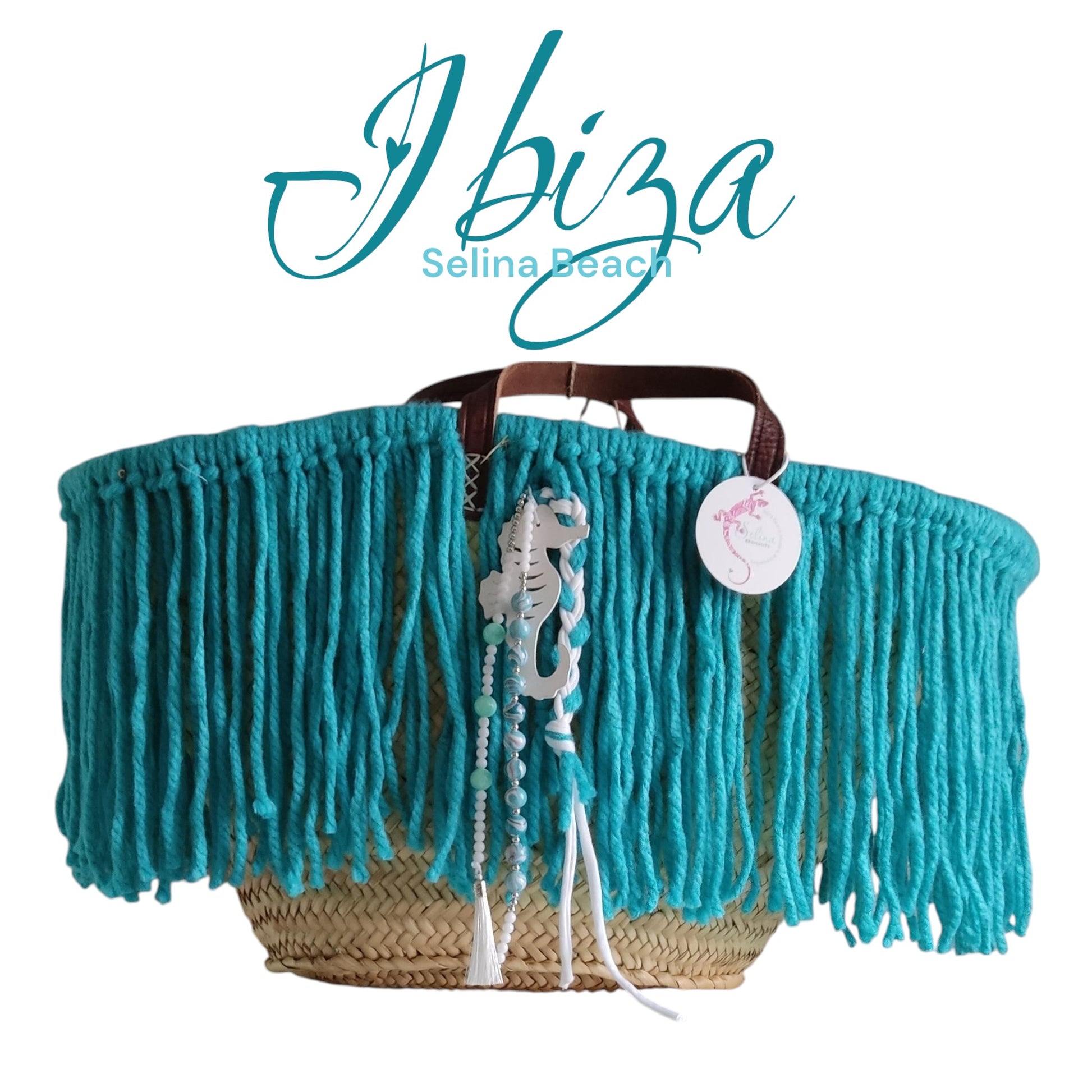Ibiza Boho Strandtasche Korbtasche XL aus Palmblättern gebunden mit zwei Tragegriffen aus stabilem Leder. Verziert mit vielen Fransen im sommerlichen frischen Farbton Türkis. Als Accessoire ziert vorn ein geflochtener Zopf und ein weißes Seepferdchen mit zwei Perlenkettchen in Türkis und Weiß mit Silber abgesetzt, als Anhänger eine hübsche weiße Quaste.