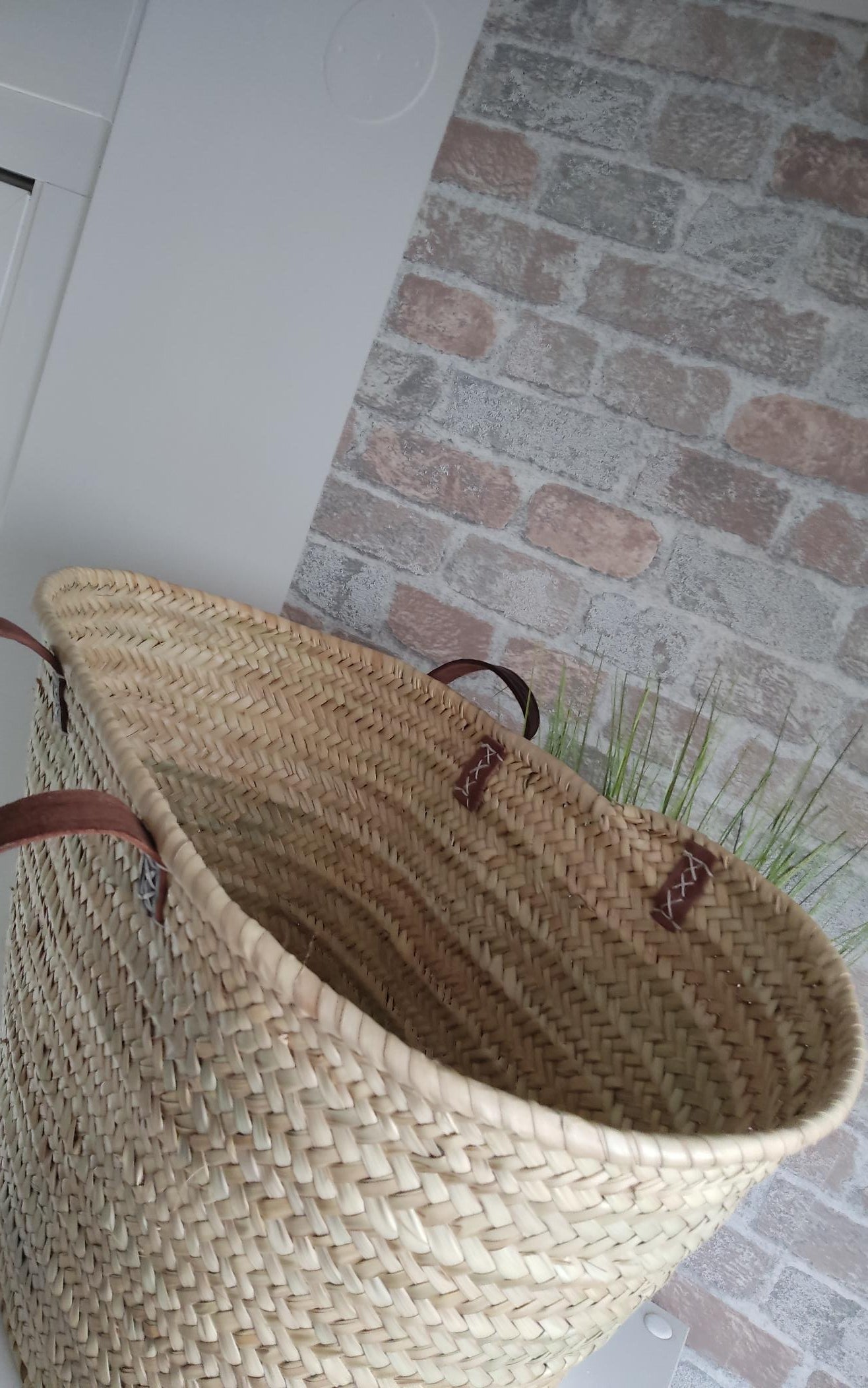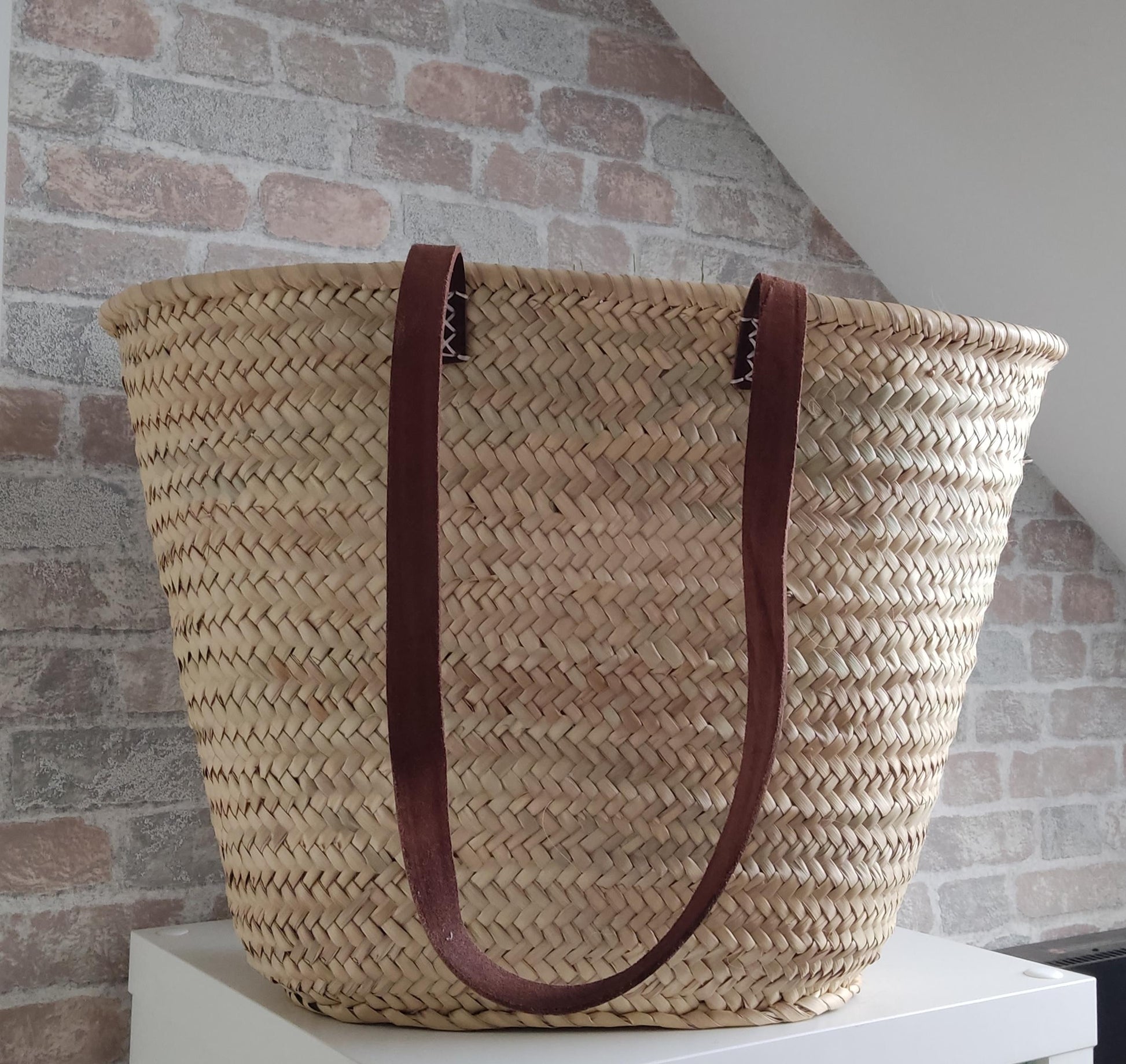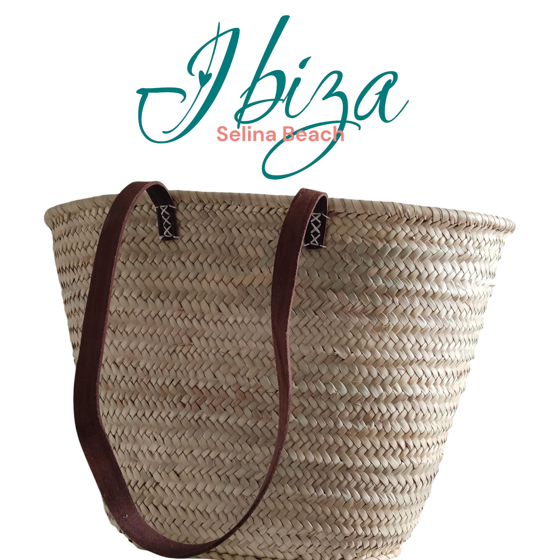 Hübsche XXL Ibiza Korbtasche Strandtasche Shoppingtasche in Natur mit stabilen braunen Umhängeriemen aus Leder. Offen.